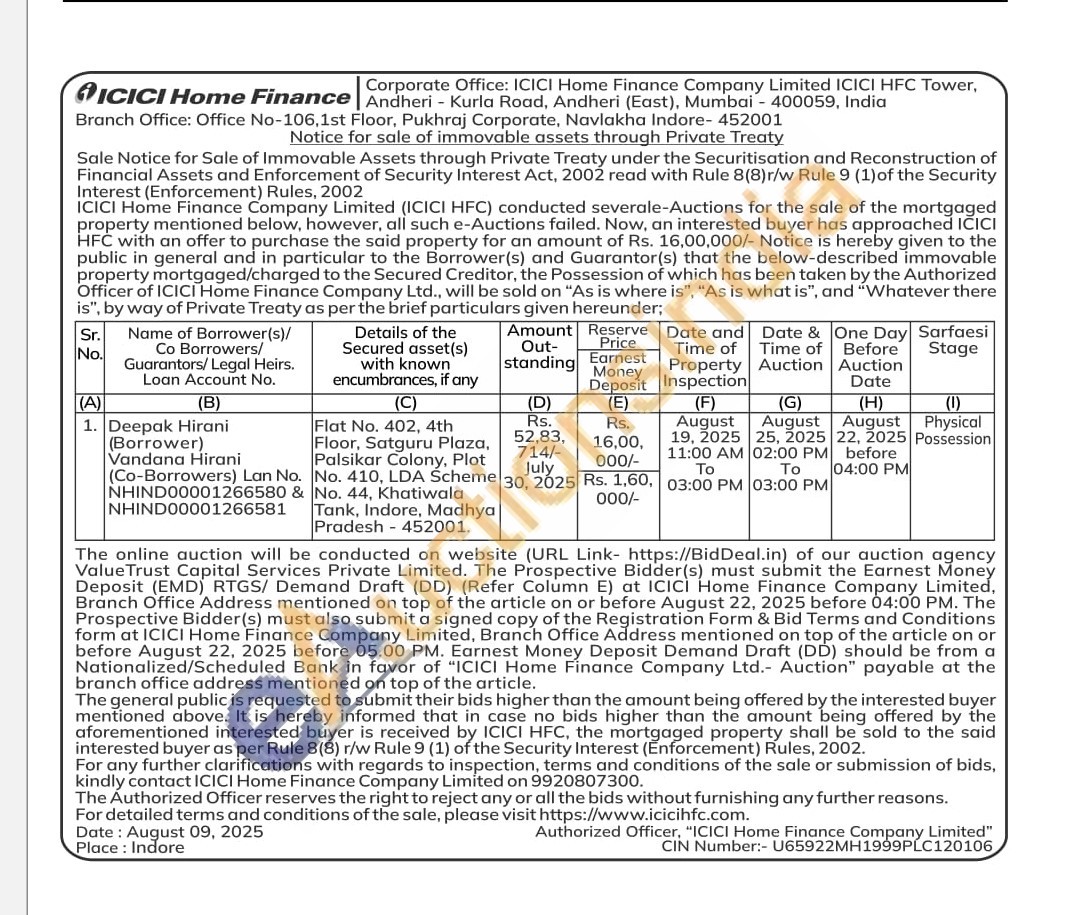 Flat No. 402, 4th Floor, Satguru Plaza, Palsikar Colony, Plot No. 44, Khatiwala Tank, Indore, Madhya Pradesh-452001. No. 410, LDA Scheme