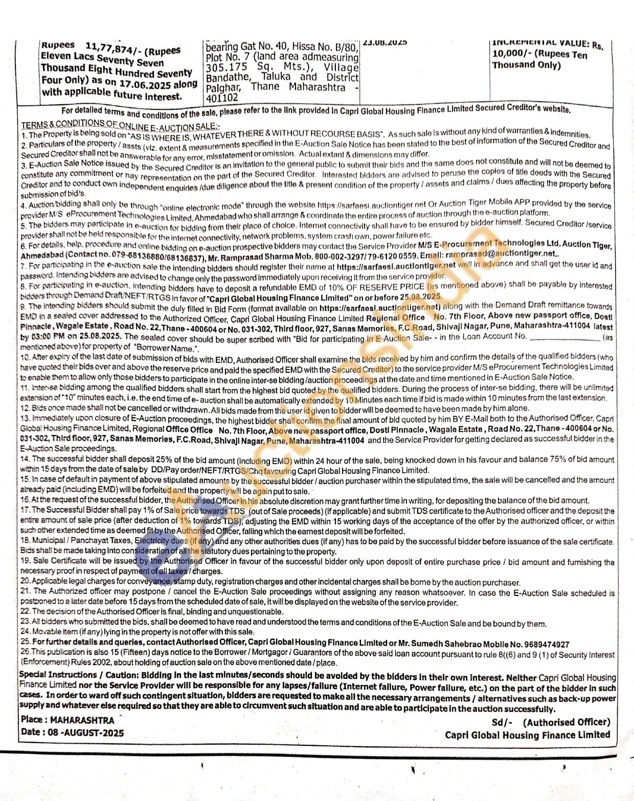 Contact Authorised Officer, Capri Global Housing Finance Limited or Mr. Sumedh Sahebrao Mobile No. 9689474927