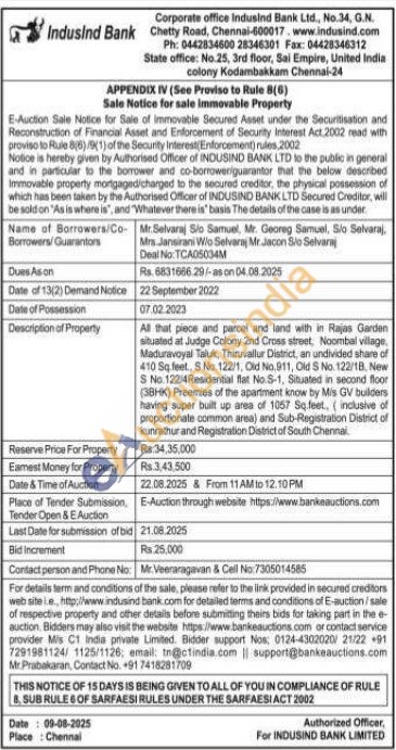 All that piece and parcel and land with in Rajas Garden situated at Judge Colony 2nd Cross street, Noombal village, Maduravoyal Taluk, Thiruvallur District, an undivided share of 410 Sq. feet., S No. 122/1, Old No.911, Old S No. 122/18, New S No.122/4Residential flat No.S-1, Situated in second floor (38HK) Preemies of the apartment know by Mis GV builders having super built up area of 1057 Sq feet., (inclusive of proportionate common area) and Sub-Registration District of kunrathur and Registration District of South Chennai