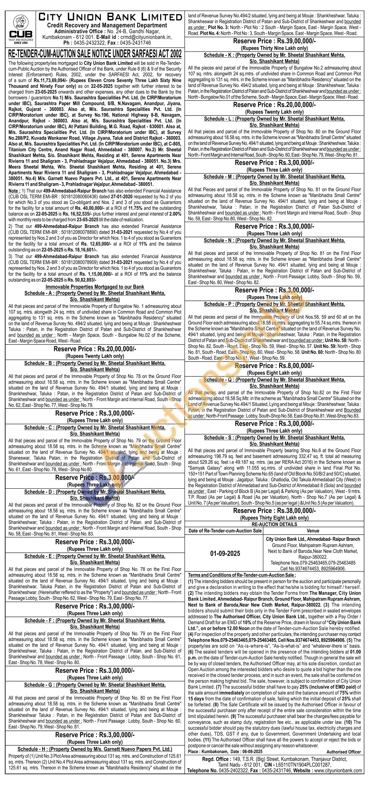 Schedule-L: (Property Owned by Mr. Sheetal Shashikant Mehta, S/o. Shashikant Mehta) All that pieces and parcel of the Immovable Property of Shop No. 80 on the Ground Floor admeasuring about 18.58 sq. mtrs. in the Scheme known as "Manibhadra Small Centre" situated on the land of Revenue Survey No. 494/1 situated, lying and being at Mouje: Shankheshwar, Taluka: Patan, in the Registration District of Patan and Sub-District of Shankheshwar and bounded as under: North-Front Margin and Internal Road, South-Shop No. 60, East-Shop No. 79, West-Shop No. 81