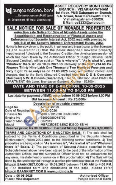 Description of movable property Regd. No AP39EJ8899 Date of Registration 26-03-2020 Chassis No WDD2131226L0256000619 Engine No :65692980048702 Year of Manufacturing 06/2019 Model MERCEDEZ BENZ E350D BS VI
