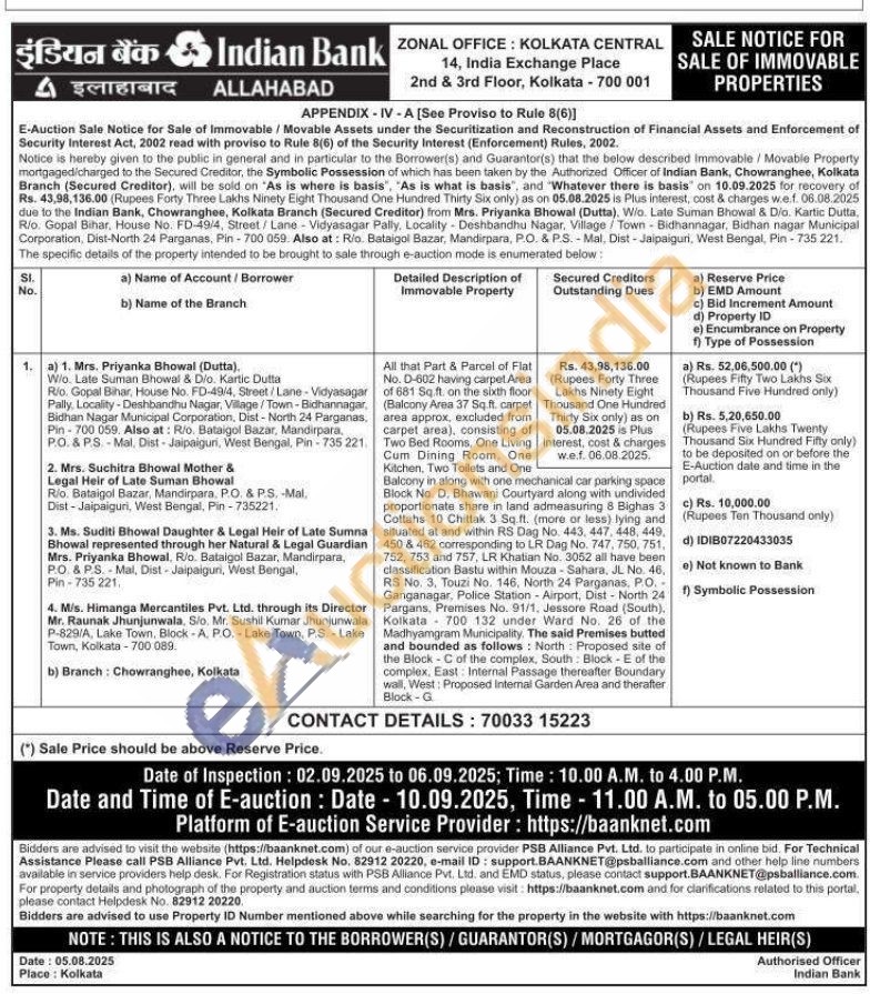 All that Part & Parcel of Flat No. D-602 having carpet Area of 681 Sq.ft. on the sixth floor (Balcony Area 37 Sq.ft. carpet area approx, excluded from carpet area), consisting of Two Bed Rooms, One Living Cum Dining Room, One Kitchen, Two Toilets and One Balcony in along with one mechanical car parking space Block No. D. Bhawani Courtyard along with undivided proportionate share in land admeasuring 8 Bighas 3 Coltahs 10 Chittak 3 Sq.ft. (more or less) lying and situated at and within RS Dag No. 443, 447, 448, 449, 450 & 462 corresponding to LR Dag No. 747, 750, 751, 752, 753 and 757, LR Khatian No. 3052 all have been classification Bastu within Mouza-Sahara, JL No. 46, RS No. 3, Touzi No. 146. North 24 Parganas. PO.-Ganganagar, Police Station Airport, Dist-North 24 Pargans, Premises No. 91/1, Jessore Road (South), Kolkata 700 132 under Ward No. 26 of the Madhyamgram Municipality. The said Premises butted and bounded as follows: North Proposed site of the Block-C of the complex, South Block-E of the complex. East: Internal Passage thereafter Boundary wall, West: Proposed Internal Garden Area and therafter Block-G