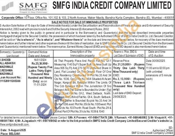 All That Property Piece And Parcel Flat No. G1-1 Measuring 1140 Sq Ft Super Built Up Area (built Up Area 905 Sq Ft) And 270 Sq Ft Undivided Share In Land, Flat Located On The Ground Floor Of One Day Residency Constructed in Plot No.33 And 34 EMD: Cts No. 1036, Out Of Rs No. 4514 Situaled At Azam Nagar, Kangrali Bk, Belagavi Within The Limits Of The Cob Belagavi Within The Jurisdiction Of Sro Belagavi And The Same Is Bounded As Under: Flat No.gf-1 East Flat No. GF-2, West Setback, North: Entrance And Lift And Flat No. Gf-4, South: Selback, And The Same is Bounded Byplat No.33 And 34 Cts No.1036.east: Plot No.35/cts No. 1035west: Pol No.32/cts No. 1037north: Road South: Plot No 29 & 30And Part Of Plot No.31/cts No. 1039 & 1040
