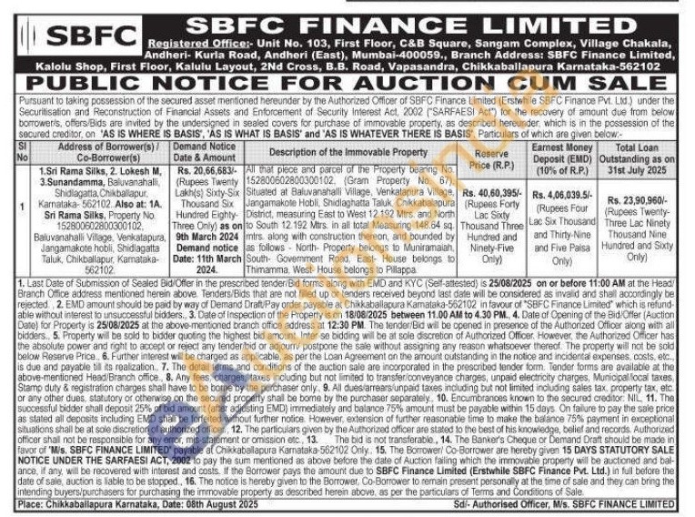 All that piece and parcel of the Property bearing No 152800602800300102, (Gram Property No. 67). Situated at Baluvanahalli Village, Venkatapura Village, Jangamakote Hobli, Shidloghatta Taluk, Chikkabalapur District, measuring East to West 12.192 Mtrs, and North to South 12. 192 Mirs. in all total Measuring 148.64 sq. mtrs along with construction thereon, and bounded by as follows North Property belongs to Muniramaiah, South Government Road. East House belongs to Thimamma, West- House belongs to Pillappa