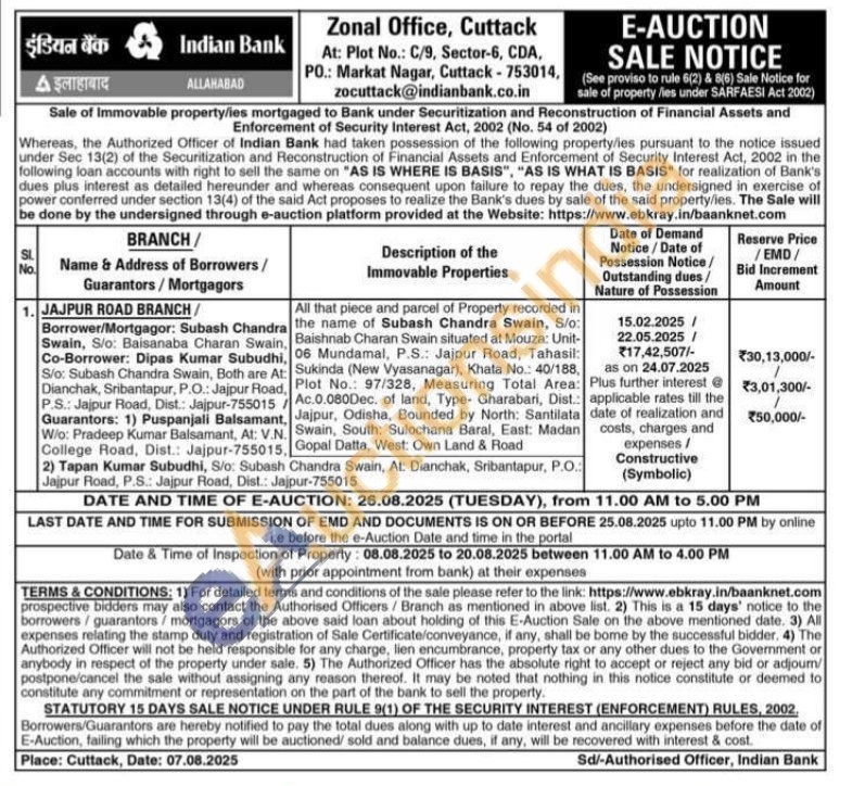 All that piece and parcel of Property recorded in the name of Subash Chandra Swain, S/o: Baishnab Charan Swain situated at Mouza: Unit-06 Mundamal, P.S.: Jajpur Road, Tahasil: Sukinda (New Vyasanagar), Khata No.: 40/188, Plot No.: 97/328, Measuring Ac.0.080Dec. of land, Type- Gharabari, Dist. Jajpur, Odisha, Bounded by North: Santilata Swain, South: Sulochana Baral, East: Madan Gopal Datta, West: Own Land & Road