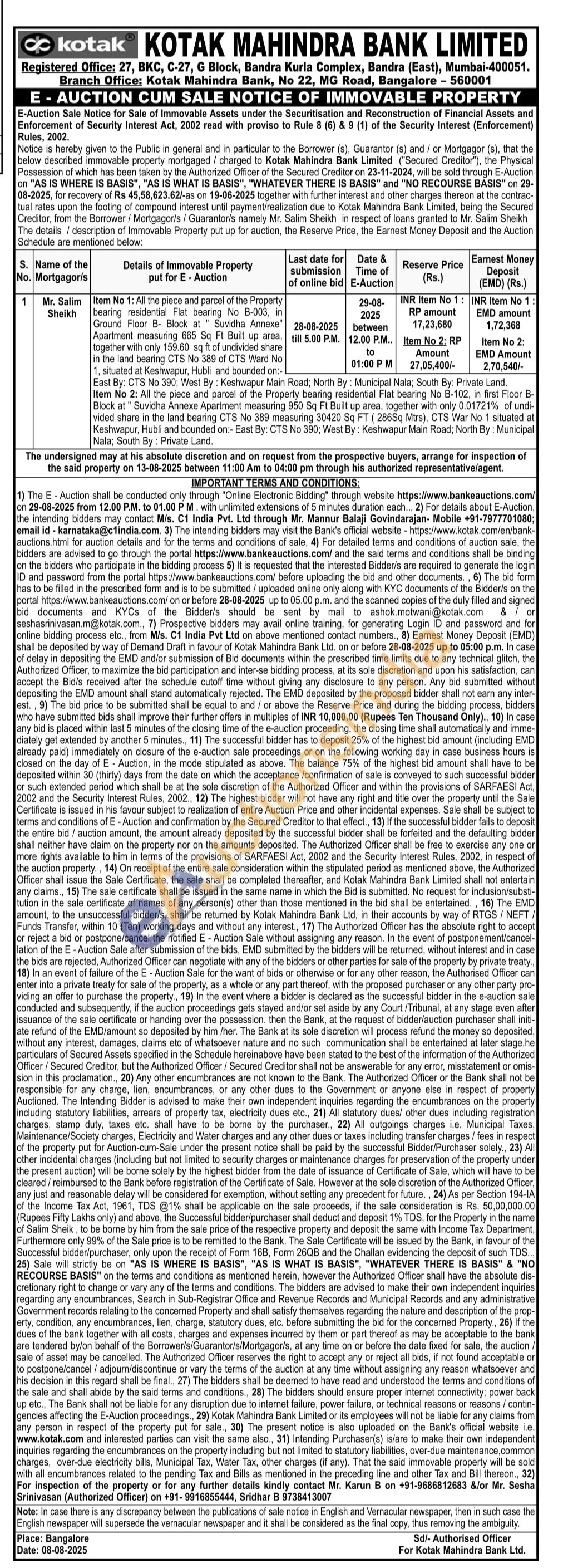 Item No 1: All the piece and parcel of the Property bearing residential Flat bearing No B-003, in Ground Floor B- Block at Suvidha Annexe" Apartment measuring 665 Sq Ft Built up area, together with only 159.60 sq ft of undivided share in the land bearing CTS No 389 of CTS Ward No 1, situated at Keshwapur, Hubli and bounded on:-East By: CTS No 390; West By: Keshwapur Main Road; North By: Municipal Nala; South By: Private Land.