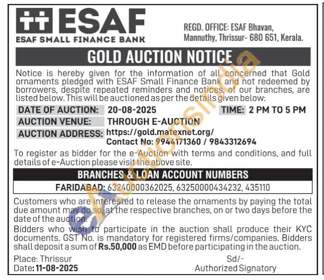 ESAF SMALL FINANCE BANK Gold Auctions Auction in Faridabad