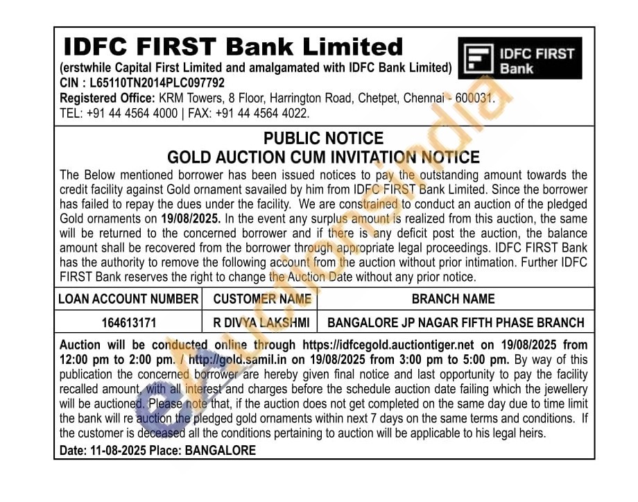 IDFC First Bank Ltd Gold Auctions Auction in Bengaluru