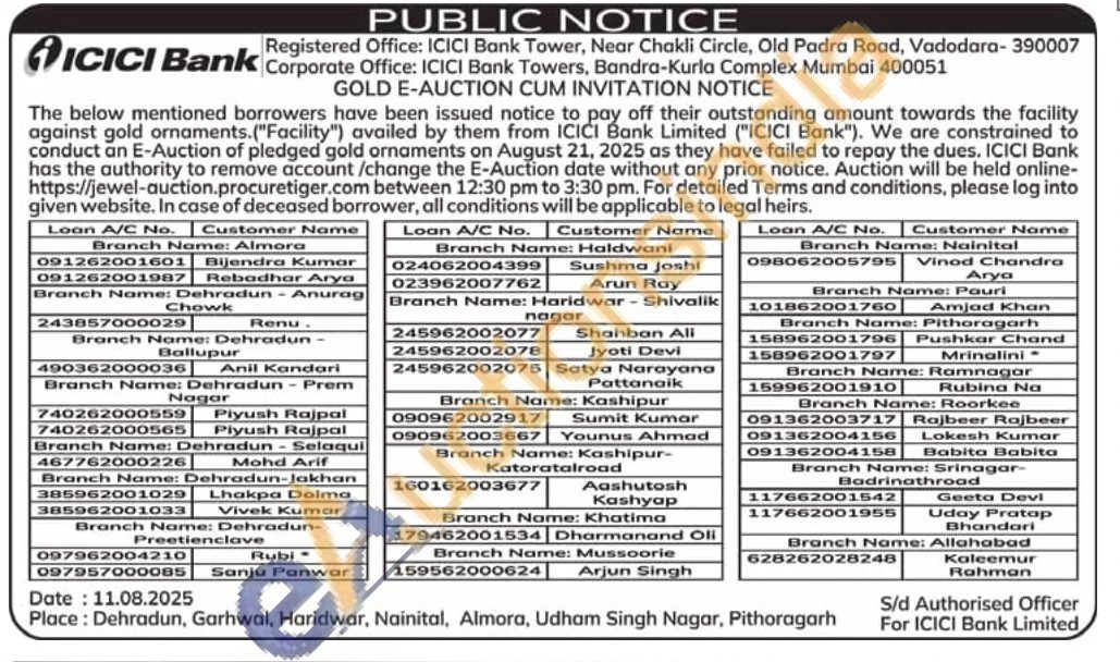 ICICI Bank Gold Auctions Auction in Dehradun