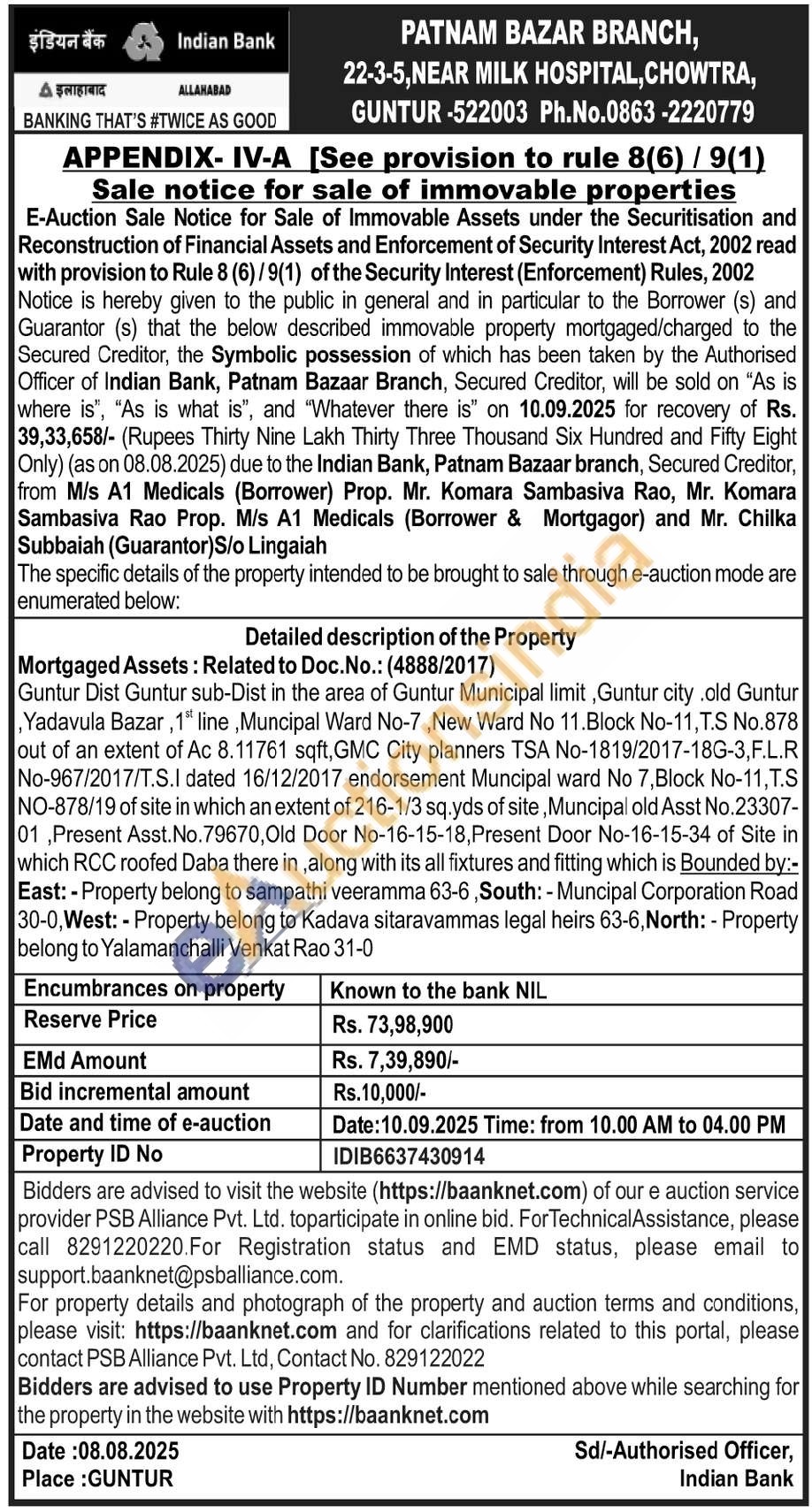 Guntur Dist Guntur sub-Dist in the area of Guntur Municipal limit, Guntur city.old Guntur Yadavula Bazar, 1" line, Muncipal Ward No-7, New Ward No 11.Block No-11, T.S No.878 out of an extent of Ac 8.11761 sqft, GMC City planners TSA No-1819/2017-18G-3,F.L.R No-967/2017/T.S.I dated 16/12/2017 endorsement Muncipal ward No 7, Block No-11, T.S NO-878/19 of site in which an extent of 216-1/3 sq.yds of site, Muncipal old Asst No.23307-01 Present Asst. No. 79670, Old Door No-16-15-18, Present Door No-16-15-34 of Site in which RCC roofed Daba there in, along with its all fixtures and fitting which is Bounded by:-East:-Property belong to sampathi veeramma 63-6, South: - Muncipal Corporation Road 30-0, West: - Property belong to Kadava sitaravammas legal heirs 63-6, North: - Property belong to Yalamanchalli Venkat Rao 31-0