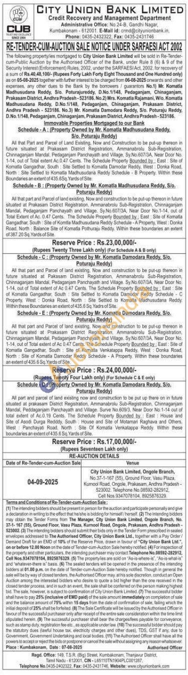 Schedule-E: (Property Owned by Mr. Komatla Damodara Reddy. S/o. Poturaju Reddy) : All that part and Parcel of land existing. Now and construction to be put-up thereon in future situated at Prakasam District Registration, Ammanabrolu Sub-Registration, Chinnaganjam Mandal, Pedaganjam Panchayath and Village. Sy.No.607/3A, Near Door No. 1-14, out of Total extent of Ac 0.47 Cents. The Schedule Property Bounded by: East: Site of Komatia Gangadhar, South Site of Komatia Venkatappa Reddy, West: Donka Road, North Site of Komatia Damodar Reddy Schedule A Property. Within these boundaries an extent of 435.6 Sq. Yards of Site