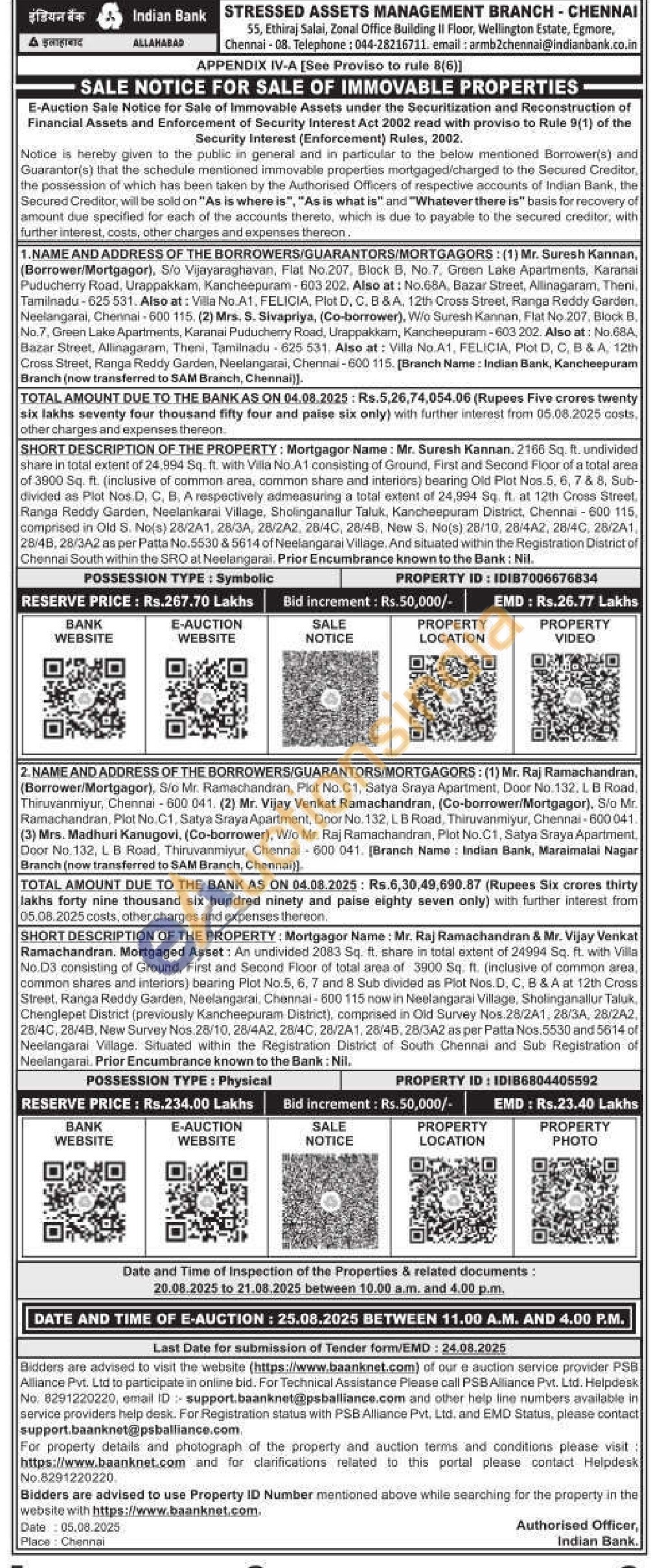 SHORT DESCRIPTION OF THE PROPERTY: Mortgager Name: Mr. Raj Ramachandran & Mr. Vijay Vankat Ramachandran. Mortgaged Asset: An undivided 2083 Sq. ft. share in total extent of 24994 50 ft with Villa No. D3 consisting of Ground. First and Second Floor of total area of 3900 Su ft. (inclusive of common area. common shares and interiors) bearing Plot No.5, 6, 7 and 8 Sub divided as Plot Nos.D. C. B&A 12th Cross Street, Ranga Reddy Garden, Neelangarai. Chennal 600 115 now in Neelangarai Village, Sholinganatur Taluk Chenglepet District (previously Kancheepuram District), compnsed in Old Survey Nos 28/241, 28/3A, 28/2A2 28:40, 28/48. New Survey Nos 28/10, 28/442, 28/40, 28/2A1. 28/48. 28/342 as per Patta Nos 5530 and 5614 of Neelangarai Village Situated within the Registration District of South Chennai and Suti Registration of Neolangarai. Prior Encumbrance known to the Bank: Nil