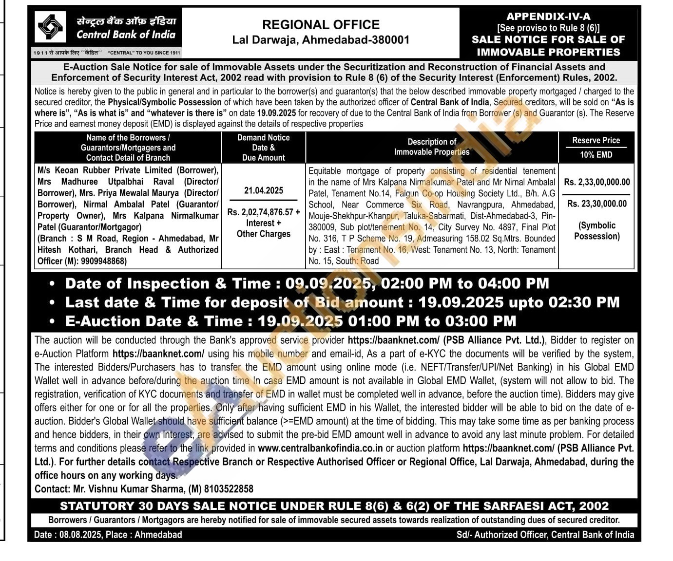 Equitable mortgage of property consisting of residential tenement in the name of Mrs Kalpana Nirmalkumar Patel and Mr Nimal Ambalal Patel, Tenament No.14, Falgun Co-op Housing Society Ltd., B/h. A.G School, Near Commerce Six Road, Navrangpura, Ahmedabad, Mouje-Shekhpur-Khanpur, Taluka-Sabarmati, Dist-Ahmedabad-3, Pin-380009, Sub plot/tenement No. 14, City Survey No. 4897, Final Plot No. 316, T P Scheme No. 19, Admeasuring 158.02 Sq.Mtrs. Bounded by: East: Tenament No. 16, West: Tenament No. 13, North: Tenament No. 15, South: Road