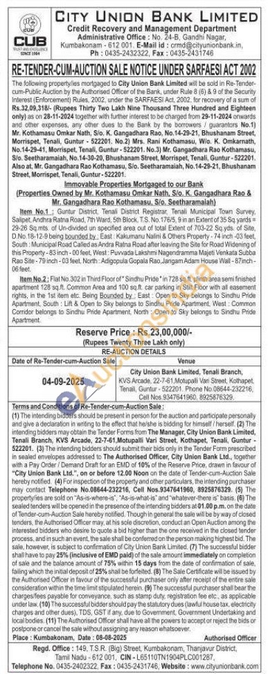 Mr. Gangadhara Rao Kothamasu. Sio. Seetharamalah) Item No.1 Guntur District, Tenali District Registrat, Tenali Municipal Town Survey, Salipet, Andhra Ratna Road, 7th Ward, 5th Block, T.S. No. 178/5 9 in an Extent of 35 Sq yards 29-26 Sq mts of Un-divided un specified area out of total Extent of 703-22 Sq.yds of Site, D.No. 18-12-9 being bounded by East Kakumanu Nalini & Others Property-74 inch-03 feet, South: Municipal Road Called as Andra Ratna Road after leaving the Site for Road Widening of this Property-83 inch-00 feet, West: Puvada Lakshmi Nagendramma Majeti Venkata Subba Rao Site-79 inch-03 feet, North Adigopula Gopala Rao, Jangam Adam House Wall-87inch-06 feet. Item No.2; Flat No.302 in Third Floor of Sindhu Pride in 728 sq.ft. plinth area semi finished apartment 128 sq.ft. Common Area and 100 sq.ft. car parking in Salt Floor with all easemerst rights, in the 1st item etc. Being Bounded by East Open to Sky belongs to Sindhu Pride Apartment, South: Lift & Open to Sky belongs to Sindhu Pride Apartment. West: Common Corridor belongs to Sindhu Pride Apartment, North: Open to Sky belongs to Sindhu Pride Apartment