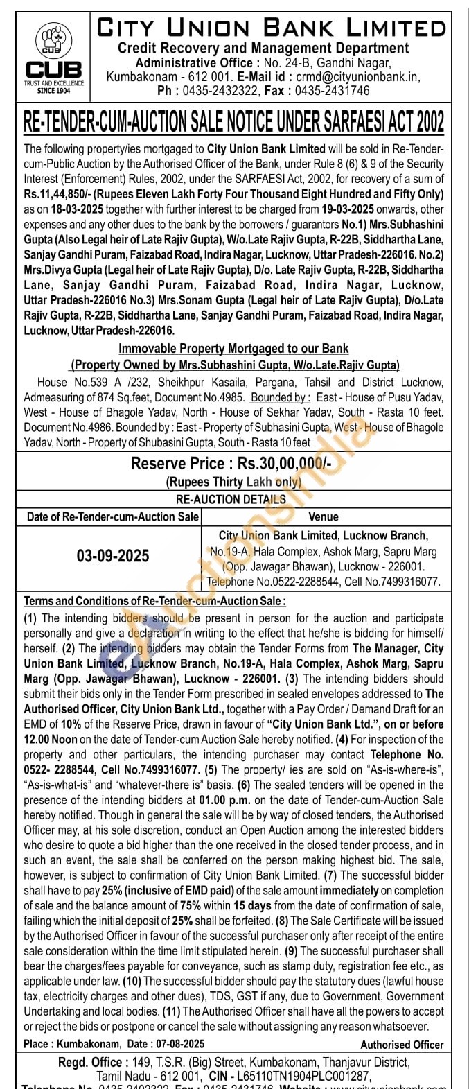 House No.539 A/232, Sheikhpur Kasaila, Pargana, Tahsil and District Lucknow, Admeasuring of 874 Sq.feet, Document No.4985. Bounded by: East-House of Pusu Yadav, West House of Bhagole Yadav, North House of Sekhar Yadav, South Rasta 10 feet. Document No. 4986. Bounded by: East-Property of Subhasini Gupta, West-House of Bhagole Yadav, North-Property of Shubasini Gupta, South-Rasta 10 feet