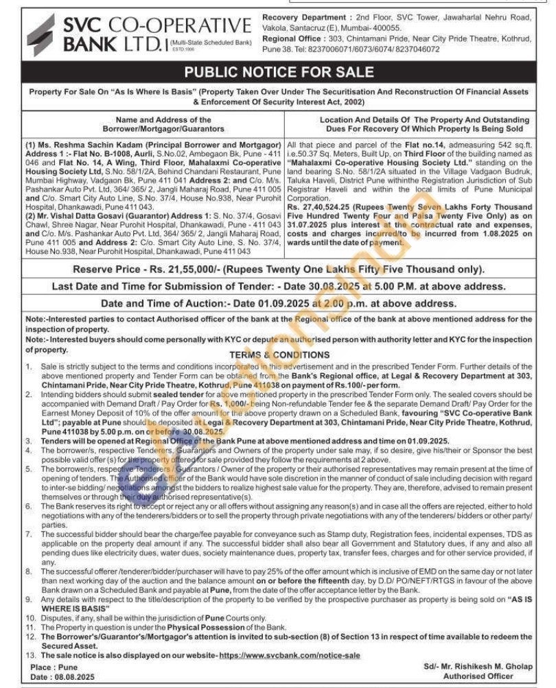 All that piece and parcel of the Flat no.14, admeasuring 542 sq.ft. ie.50.37 Sq. Meters, Built Up, on Third Floor of the building named as "Mahalaxmi Co-operative Housing Society Ltd." standing on the land bearing S.No. 58/1/2A situated in the Village Vadgaon Budruk, Taluka Haveli, District Pune withinthe Registration Jurisdiction of Sub Registrar Haveli and within the local limits of Pune Municipal Corporation,