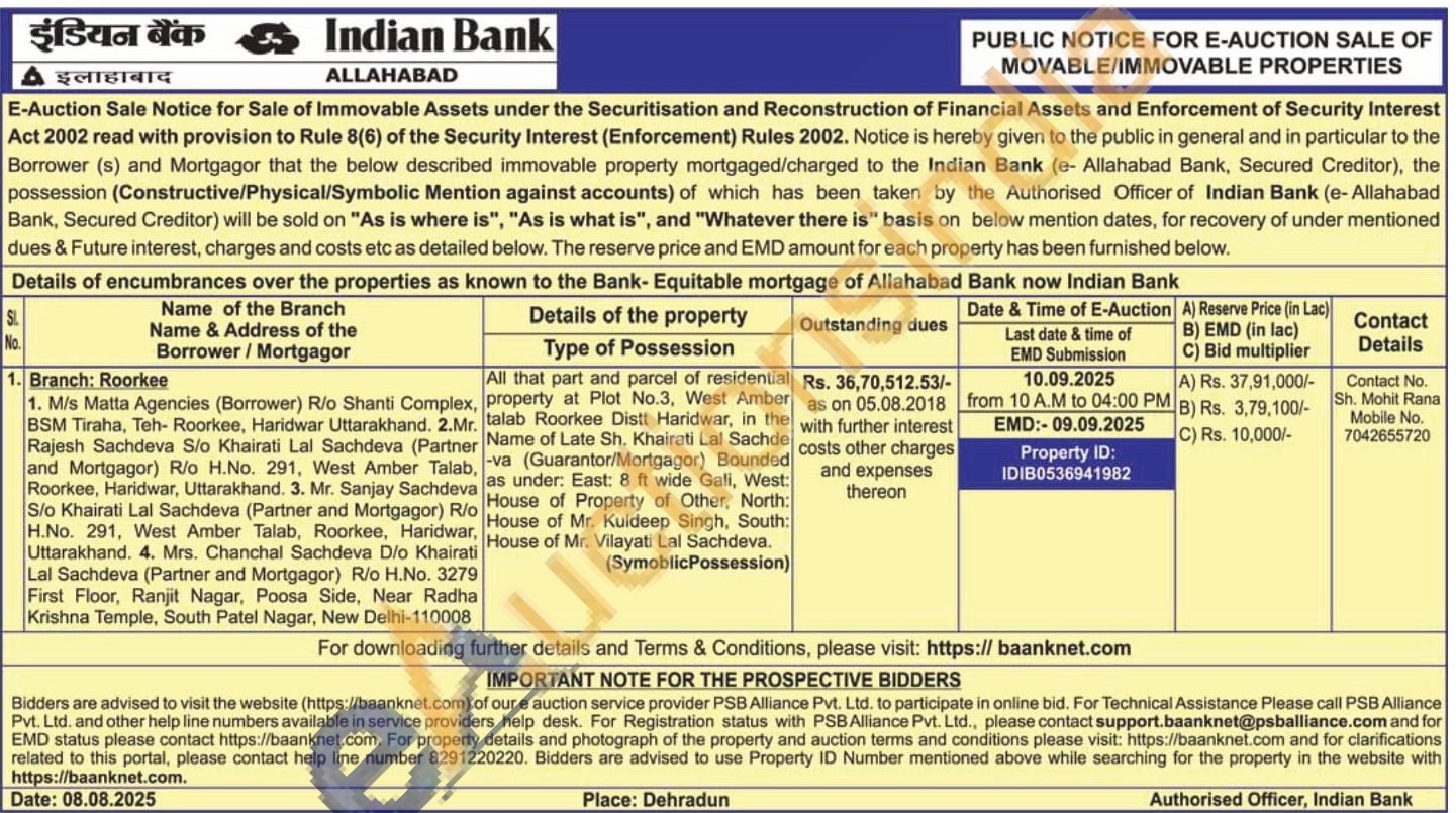 Residential property at Plot No.3, West Amber talab Roorkee Distt Haridwar, in the Name of Late Sh. Khairati Lal Sachde va (Guarantor/Mortgagor) Bounded as under. East: 8 ft wide Gali, West: House of Property of Other, North: House of Mr. Kuldeep Singh, South: House of Mr. Vilayati Lal Sachdeva.
