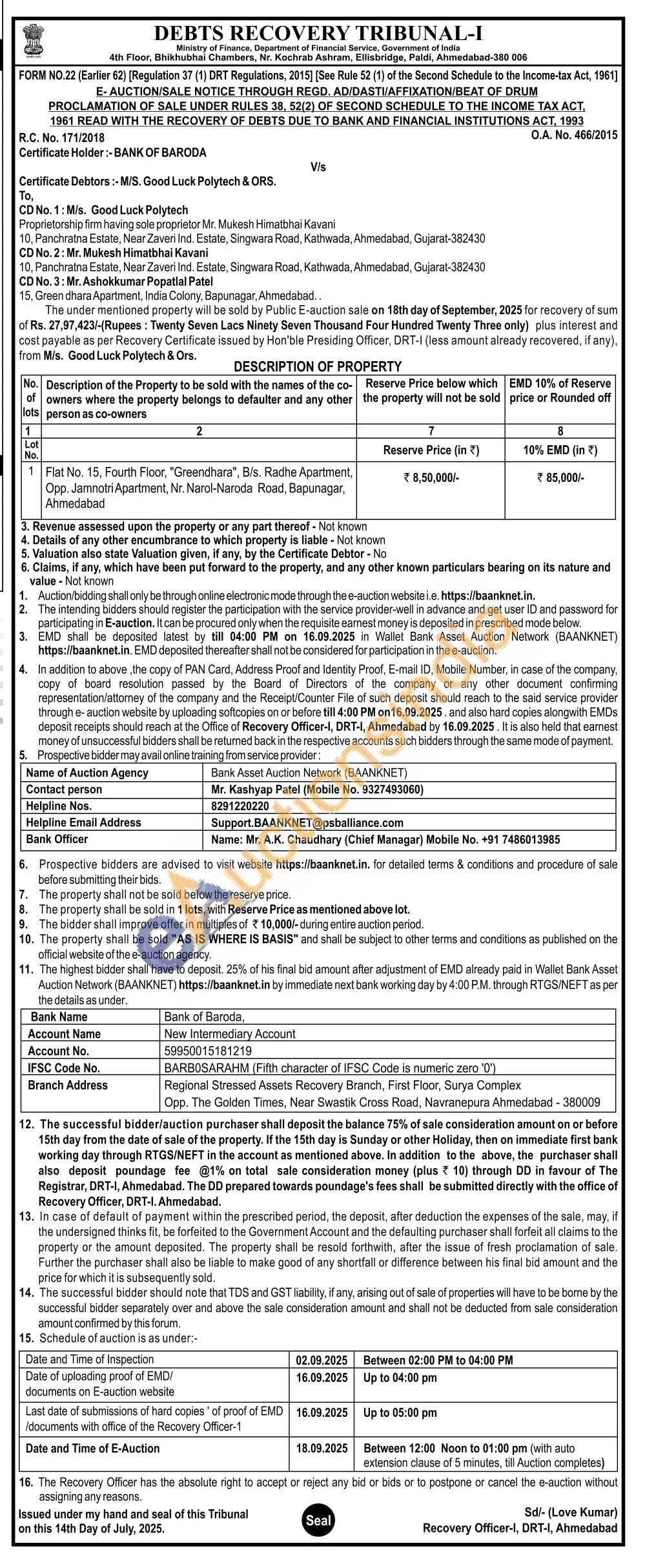 Flat No. 15, Fourth Floor, "Greendhara", B/s. Radhe Apartment, Opp. Jamnotri Apartment, Nr. Narol-Naroda Road, Bapunagar, Ahmedabad