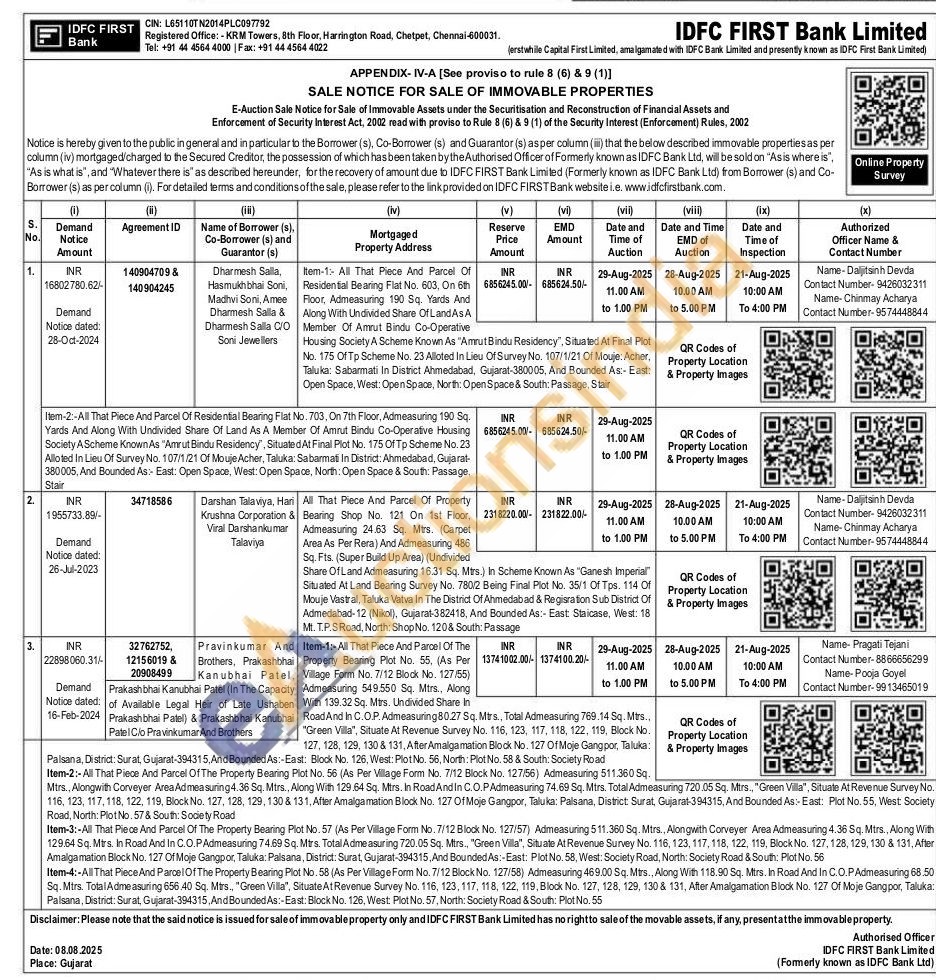 All That Piece And Parcel Of The Property Bearing Plot No. 55, (As Per Village Form No. 7/12 Block No. 127/55) Admeasuring 549.550 Sq. Mtrs., Along With 139.32 Sq. Mtrs. Undivided Share In RoadAnd In C.O.P. Admeasuring 80.27 Sq. Mtrs., Total Admeasuring 769.14 Sq. Mtrs.. "Green Villa", Situate At Revenue Survey No. 116, 123, 117, 118, 122, 119, Block No. 127, 128, 129, 130 & 131, After Amalgamation Block No. 127 Of Moje Gangpor, Taluka:Palsana, District: Surat, Gujarat-394315, And Bounded As:-East: Block No. 126. West: Plot No. 56, North: Plot No. 58 & South: Society Road Item-2:-All That Piece And Parcel Of The Property Bearing Plot No. 56 (As Per Village Form No. 7/12 Block No. 127/56) Admeasuring 511.360 Sq. Mtrs.. Alongwith Corveyer Area Ad measuring 4.36 Sq. Mtrs., Along With 129.64 Sq. Mtrs. In Road And In C.O.PAdmeasuring 74.69 Sq. Mtrs. Total Admeasuring 720.05 Sq. Mtrs., "Green Villa", Situate At Revenue Survey No. 116, 123, 117, 118, 122, 119, Block No. 127, 128, 129, 130 & 131, After Amalgamation Block No. 127 OfMoje Gangpor, Taluka: Palsana, District: Surat, Gujarat-394315, And Bounded As: East: Plot No. 55, West: Society Road, North: Plot No. 57 & South: Society Road Item-3:-All That Piece And Parcel Of The Property Bearing Plot No. 57 (As Per Village Form No. 7/12 Block No. 127/57) Admeasuring 5 11.360 Sq. Mtrs., Alongwith Corveyer Area Admeasuring 4.36 Sq. Mtrs., Along With 129.64 Sq. Mtrs. In Road And In C.O.PAdmeasuring 74.69 Sq. Mtrs. Total Admeasuring 720.05 Sq. Mtrs., "Green Villa", Situate At Revenue Survey No. 116, 123, 117, 118, 122, 119, Block No. 127, 128, 129, 130 & 131, After Amalgamation Block No. 127 Of Moje Gangpor, Taluka: Palsana, District: Surat, Gujarat-394315, And Bounded As: East: Plot No. 58, West: Society Road, North: Society Road & South: Plot No. 56 Item-4:-All That Piece And Parcel Of The Property Bearing Plot No. 58 (As Per Village Form No. 7/12 Block No. 127/58) Admeasuring 469.00 Sq. Mtrs., Along With 118.90 Sq. Mirs. In Road And In C.O.PAdmeasuring 68.50 Sq. Mtrs. Total Admeasuring 656.40 Sq. Mtrs., "Green Villa", Situate At Revenue Survey No. 116, 123, 117, 118, 122, 119, Block No. 127, 128, 129, 130 & 131, After Amalgamation Block No. 127 Of Moje Gangpor, Taluka: Palsana, District: Surat, Gujarat-394315, And Bounded As:-East: Block No. 126, West: Plot No. 57, North: Society Road & South: Plot No. 55