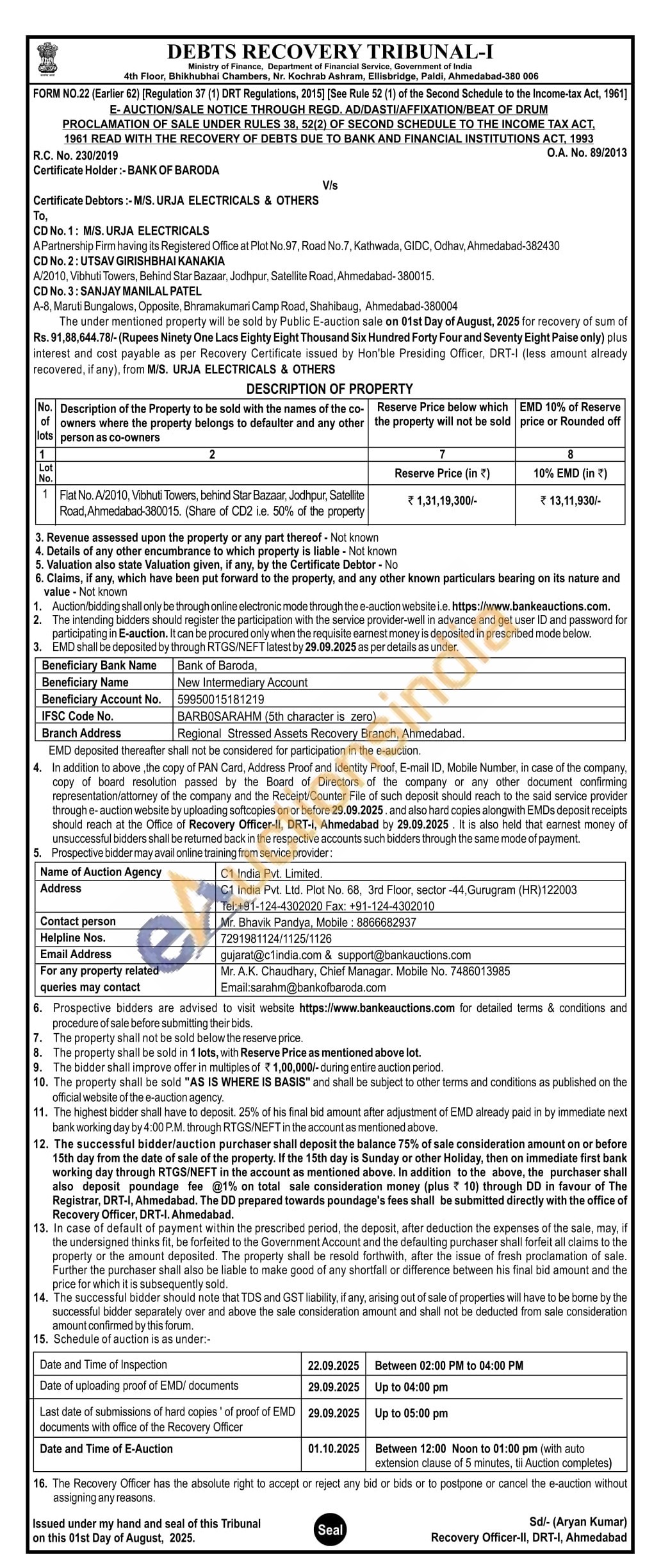 Flat No. A/2010, Vibhuti Towers, behind Star Bazaar, Jodhpur, Satellite Road, Ahmedabad-380015. (Share of CD2 i.e. 50% of the property