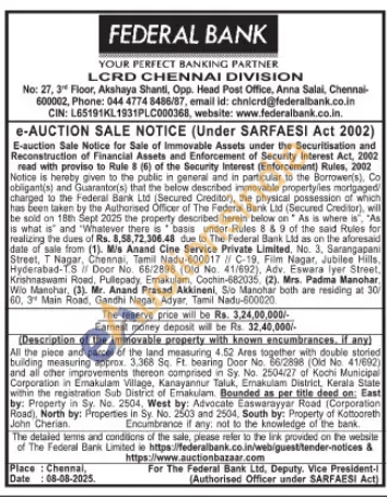 (Description of the immovable property with known encumbrances, if any) All the piece and parcel of the land measuring 4.52 Ares together with double storied building measuring approx. 3.368 Sq. Ft. bearing Door No. 66/2898 (Old No 41/692) and all other improvements thereon comprised in Sy. No. 2504/27 of Kochi Municipa Corporation in Emakulam Village, Kanayannur Taluk, Ernakulam District, Kerala State within the registration Sub District of Emakulam Bounded as per title deed on: East by: Property in Sy. No. 2504, West by: Advocate Easwarayyar Road (Corporation Road, North by: Properties in Sy No. 2503 and 2504, South by: Property of Kottooreth John Cherian. Encumbrance if any, not to the knowledge of the bank