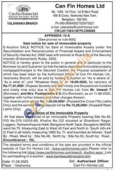 All that piece and parcel of an immovable Property bearing Site No.49, PID No.070-10205-80, Khatha No.122 situated at Shambavi Nagar, Laggere, Yeshwanthapura Hobli, Bangalore North Taluk, Bangalore-560058, ward No.70. Measuring East to West 40 Feet and North to South (40-44/2) Feet in all totally measuring 1680 Sq. Ft. and bounded as follows: East By Road, West by: Site No.48, North by Site No.50, South by: Road.