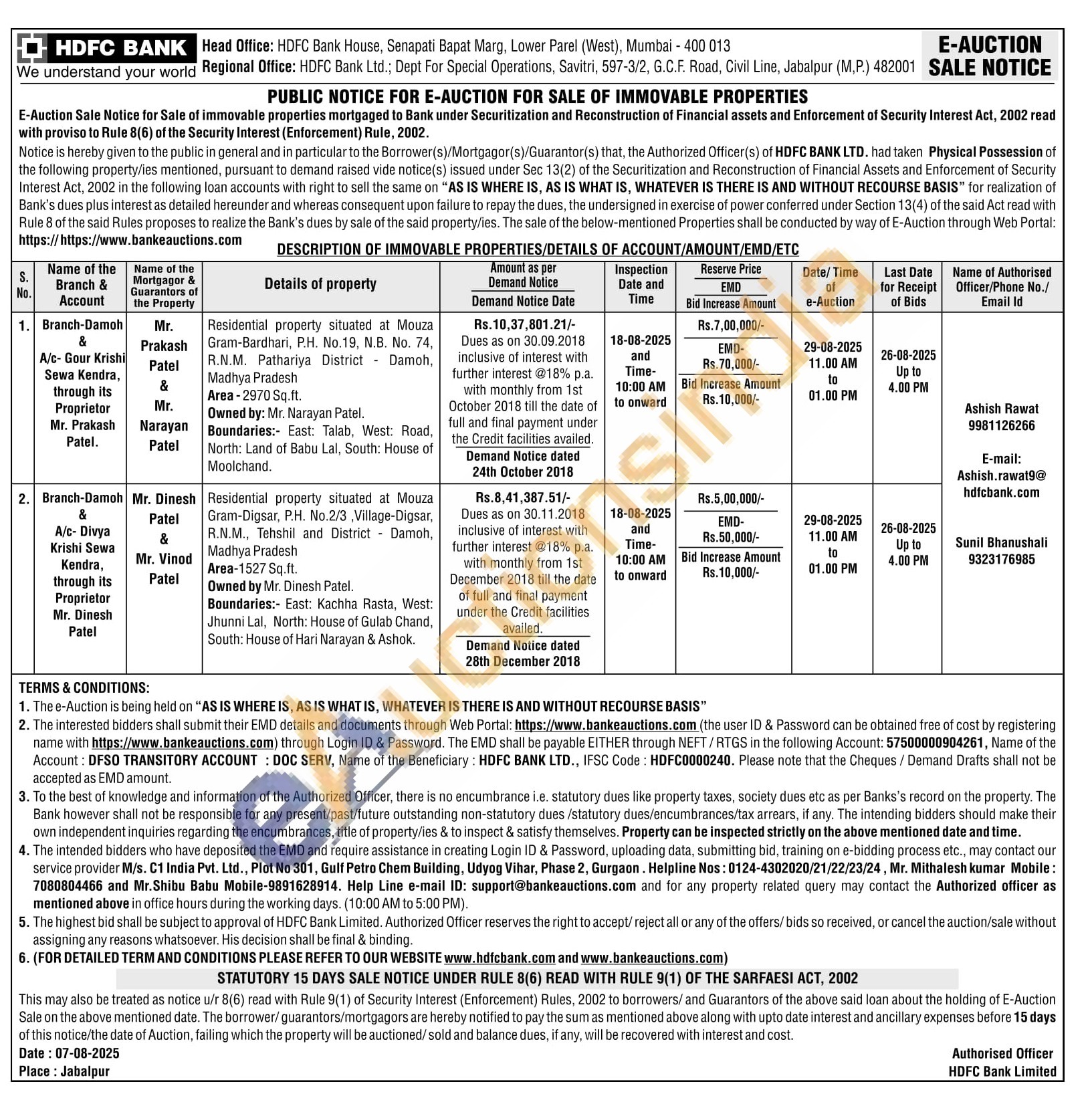 1) Residential property situated at Mouza Gram-Bardhari, P.H. No.19, N.B. No. 74, R.N.M. Pathariya District Damoh, Madhya Pradesh Area-2970 Sq.ft. Owned by: Mr. Narayan Patel. Boundaries: East: Talab, West: Road, North: Land of Babu Lal, South: House of Moolchand