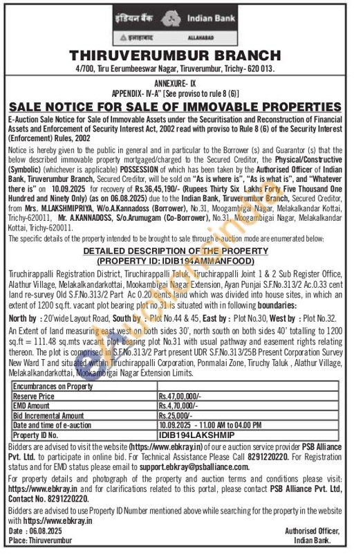 Tiruchirappalli Registration District, Tiruchirappalli Taluk, Tiruchirappalli Joint 1 & 2 Sub Register Office, Alathur Village, Melakalkan darkottai, Mookambigai Nagar Extension, Ayan Punjai S.F.No.313/2 Ac.0.33 cent land re-survey Old S.F.No.313/2 Part Ac 0.20 cents land which was divided into house sites, in which an extent of 1200 sq.ft. vacant plot bearing plot no.31 is situated with in following boundaries: North by: 20'wide Layout Road, South by Plot No.44 & 45, East by: Plot No.30, West by: Plot No.32. An Extent of land measuring east west on both sides 30', north south on both sides 40' totalling to 1200 sq.ft 111.48 sq.mts vacant plot bearing plot No.31 with usual pathway and easement rights relating thereon. The plot is comprised in S.F.No.31 3/2 Part present UDR S.F.No.313/25B Present Corporation Survey New Ward T and situated within Tiruchirappalli Corporation, Ponmalai Zone, Tiruchy Taluk, Alathur Village, Melakalkandarkottai, Mookambigai Nagar Extension Limits
