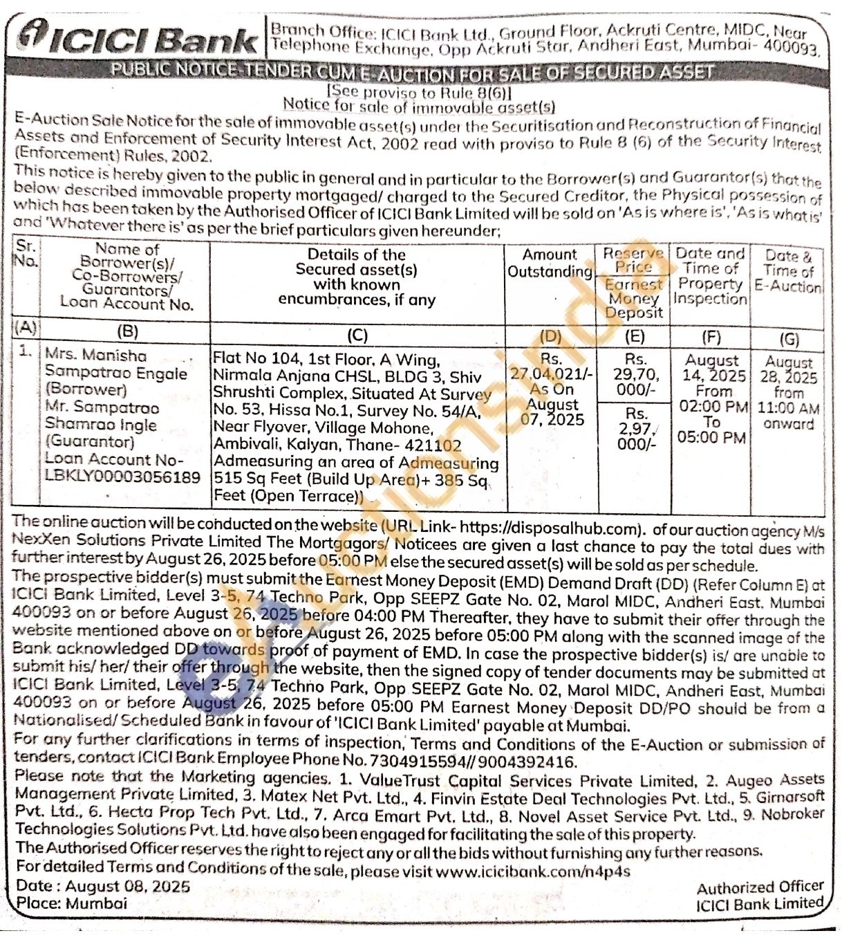 Flat No 104, 1st Floor, A Wing, Nirmala Anjana CHSL, BLDG 3, Shiv Shrushti Complex, Situated At Survey No. 53, Hissa No.1, Survey No. 54/A, Near Flyover, Village Mohone, Ambivali, Kalyan, Thane- 421102 Admeasuring an area of Admeasuring 515 Sq Feet (Build Up Area) + 385 Sq. Feet (Open Terrace)).