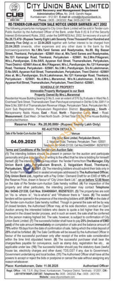 Immovable Property Mortgaged to our Bank Property Owned By Mrs.L.Marammal Residential House Buliding bearing D. No.5, over an extent of 576 Sq.ft situate in Ward No.5. Overhead Tank Street. Thamaraikulam Town Panchayat comprised in Old No S.No.3081/1 in New S.No 3081/6 of Thamaraikulam Revenue Village, Periyakulam Taluk, Periyakulam No.1 Joint Sub Registration. Periyakulam Registration District Boundaries: South Narayansamy Naidu House, East Road, North Rajendran Land. West Road Measurement: East West-24 feet North South-24 feet Total 576 Sq.ft The House Building constructed thereon.