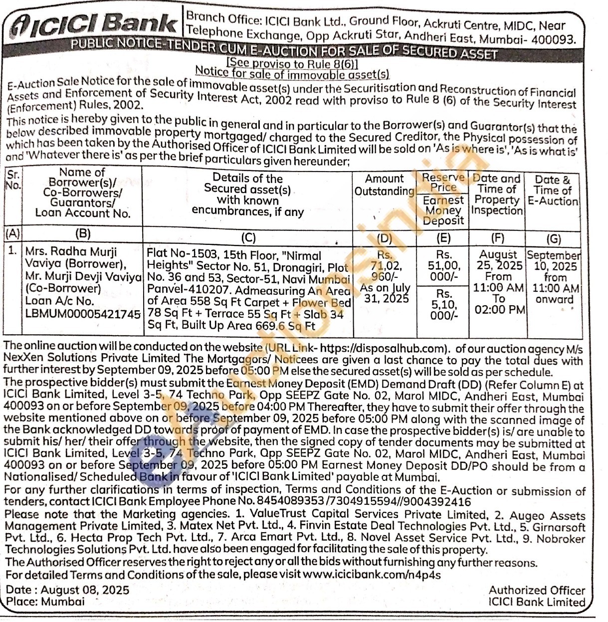 Flat No-1503, 15th Floor, "Nirmal Heights" Sector No. 51, Dronagiri, Plot No. 36 and 53, Sector-51, Navi Mumbai Panvel-410207. Admeasuring An Area of Area 558 Sq Ft Carpet + Flower Bed Sq Ft, Built Up Area 669.6 Sq Ft
