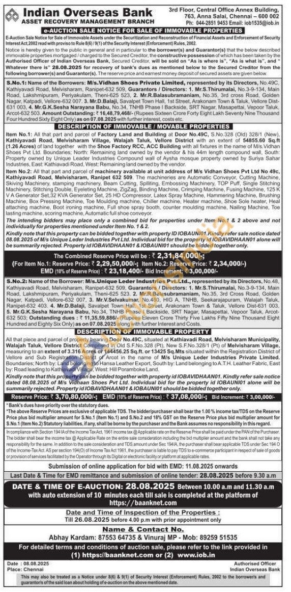 2) All that piece and parcel of property bearing Door No.49C, situated at Kathiavadi Road, Melvisharam Municipality. Walajah Taluk, Vellore District Comprised in Old S.F.No.328 (Pt), New S.F.No.328/1 (Pt) of Melvisharam Village, measuring to an extent of 3.316 Acres or 144456.25 Sq.ft. or 13425 Sq.Mts situated within the Registration District of Vellore and Sub Registration District of Arcot in the name of M/s Unique Leder Industries Private Limited. Boundaries, North by: Land belonging to Hansa Leather Export, South by: Land belonging to A.T.H. Leather Fabric, East by: Road leading to Kathiavadi Village, West: Hill Poramboke Land.