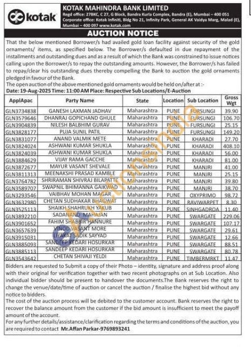 Kotak Mahindra Bank Gold Auctions Auction in Pune