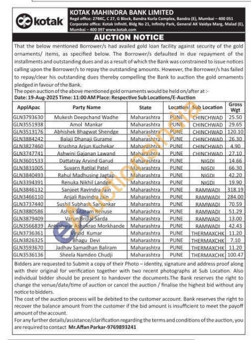 Kotak Mahindra Bank Gold Auctions Auction in Pune