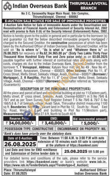 All the piece and parcel of land and residential building at plot no 11(Eastern part), Mettu street, 8" cross street, Sekkadu, Avadi, Chennai-600071 in S No 79/6 & 79/7 and as per Town Survey Field Register Extract T S No 79/6 & 79/7 S No 166/5.6 & 7 of Sekkadu village, Avadi Taluk, Thiruvallur district measuring 1100 sq ft. Boundaries: North By: Vacant land in Plot No 12, South by: Road, East by: Road, West by: Land and building in Plot No 11(Western part), Measurements: East to west 27.6 ft, North to South 40 ft.