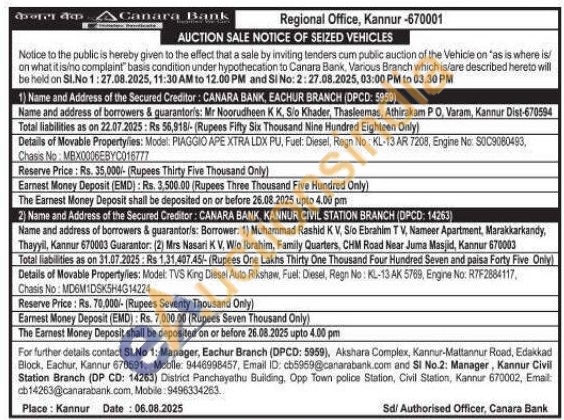 Model: TVS King Diesel Auto Rikshaw, Fuel: Diesel, Regn No: KL-13 AK 5769, Engine No. R7F2884117, Chasis No: MD6M1DSK5H4G14224