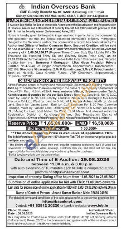 All the Part and parcel of factory land measuring 54.50 cents and building measuring 4500 sq. ft. constructed there on standing in the name of the company situated at Old S.No.472/4 Part. N.S.No.472/4A Amarambedu Village, Sriperumpudur Taluk. Kanchipuram. Bounded by: As per Sale Deed: North by: Land in S. No. 472/3C, South by: Land in S. No. 473, East by: Land in S. No. 472/48, Belongs to Mis. Nisco Precision Pvt Ltd., West by: Land in S. No. 471. As per Actual: North by: Vacant Land, South by: Vacant Land, East by: CLF Structure Pvt & 20 Feet Common Passage, West by: Vacant Land. Dimensions: On North: 41.6 Meter: On South 39.6 Meter; On East: 55.0 Meter: On West: 53.04 Meter And situated within the Registration District of Kancheepuram and Sub Registration District of Sriperumbudur. Owner of the Property: M/s Nisco Precision Private Limited