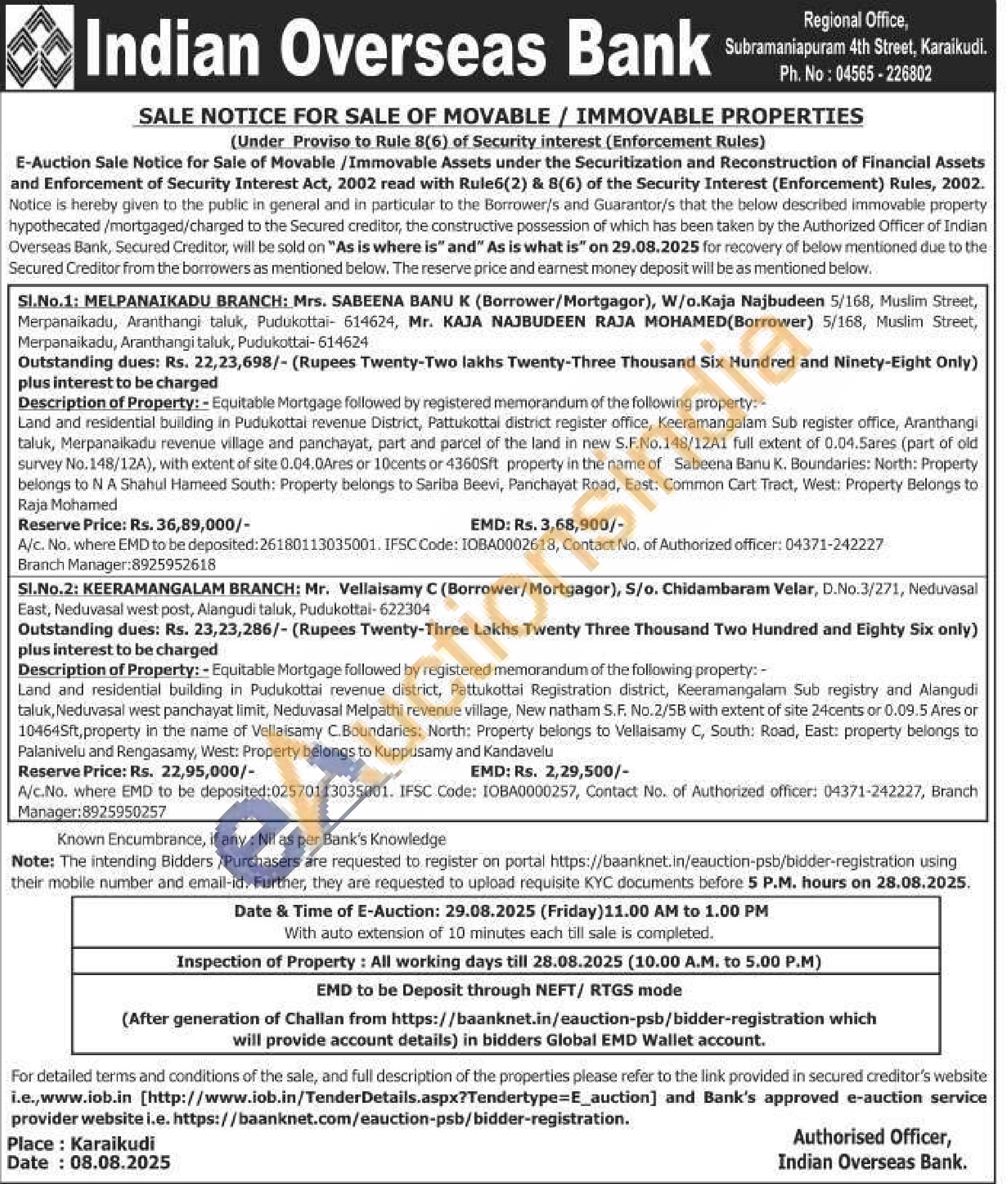Description of Property: - Equitable Mortgage followed by registered memorandum of the following property: - Land and residential building in Pudukottai revenue district, Pattukottai Registration district, Keeramangalam Sub registry and Alangudi taluk, Neduvasal west panchayat limit, Neduvasal Melpathi revenue village, New natham S.F. No.2/5B with extent of site 24cents or 0.09.5 Ares or 10464Sft, property in the name of Vellaisamy C.Boundaries: North: Property belongs to Vellaisamy C, South: Road, East: property belongs to Palanivelu and Rengasamy, West: Property belongs to Kuppusamy and Kandavelu