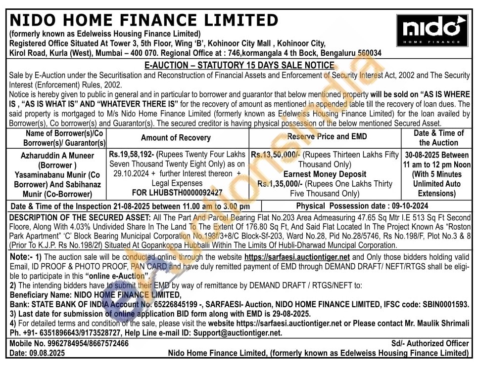 All The Part And Parcel Bearing Flat No.203 Area Admeasuring 47.65 Sq Mtr I.E 513 Sq Ft Second Floore, Along With 4.03% Undivided Share In The Land To The Extent Of 176.80 Sq Ft, And Said Flat Located In The Project Known As "Roston Park Apartment" 'C' Block Bearing Municipal Corporation No. 198f/3+8/C Block-Sf-203, Ward No.28, Pid No.28/5746, Rs No. 198/F, Plot No.3 & 8 (Prior To K.J.P. Rs No. 198/2f) Situated At Gopankoppa Hubballi Within The Limits Of Hubli-Dharwad Muncipal Corporation.