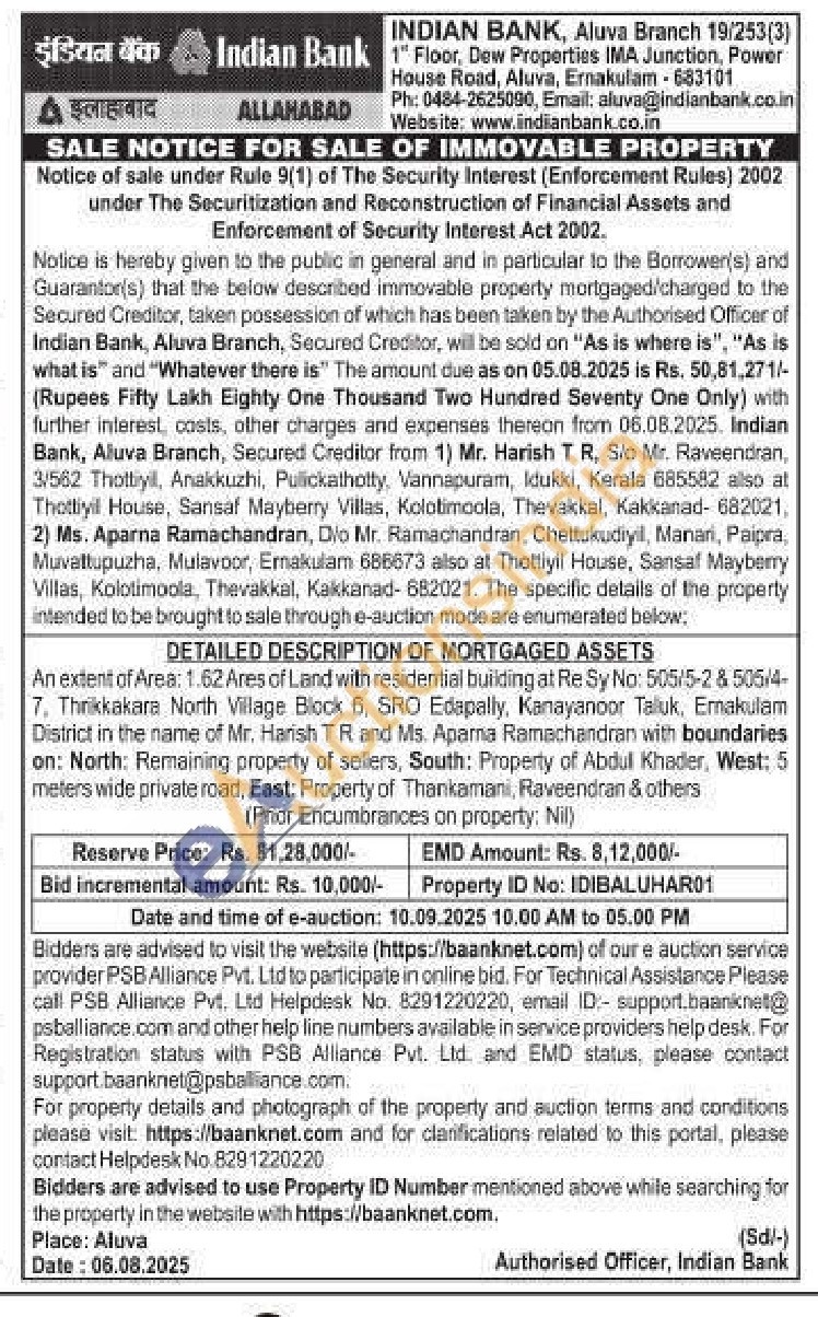 An extent of Area: 1.62 Ares of Land with residential building at Re Sy No: 505/5-2 & 505/4-7. Thrikkakara North Village Block 6, SRO Edapally, Kanayanoor Taluk, Ernakulam District in the name of Mr. Harish TR and Ms. Aparna Ramachandran with boundaries on: North: Remaining property of sellers, South: Property of Abdul Khader, West: 5 meters wide private road, East: Property of Thankamani, Raveendran & others