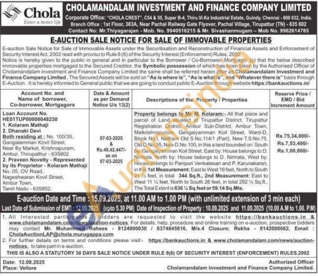 Property belongs to Mr. M. Kolaram:-All that piece and parcel of Land situated at Tirupattur District, Tirupattur Registration District, Ambur Sub-District, Ambur Town. Melkrishnapuram, Gengaiyamman Koil Street, Ward-D, Block No.1, Natham Old S. No. 114/1 (Part), New T.S.No. 75. Old D.No.35, New D.No. 100, in this a land bounded on: South by: Gengalyamman Koil Street, East by: House belongs to D. Nirmala, North by: House belongs to D. Nirmala, West by House belongs to Panipuri Venkatesan and P. Kanunakaran, in this 1st Measurement: East to West 16 feel, North to South 21 1/2 feet, in total 344 Sq.ft., 2nd Measurement: East to West 11 1/4 feet, North to South 26 feet, in total 292 1/2 Sq.ft., The Total Extent is 636 1/2 Sq.feet or 59.14 Sq.Mts