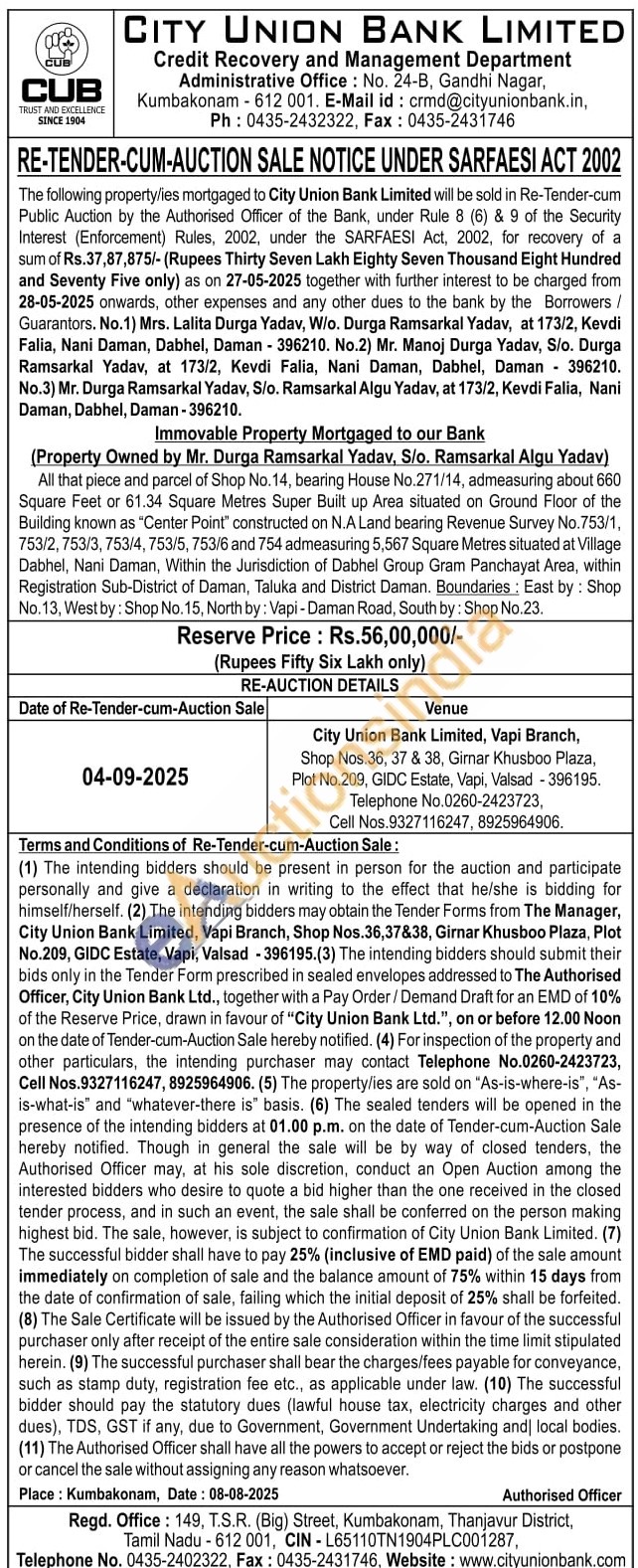 (Property Owned by Mr. Durga Ramsarkal Yadav, S/o. Ramsarkal Algu Yadav) : All that piece and parcel of Shop No. 14, bearing House No.271/14, admeasuring about 660 Square Feet or 61.34 Square Metres Super Built up Area situated on Ground Floor of the Building known as "Center Point" constructed on N.A Land bearing Revenue Survey No.753/1, 753/2, 753/3, 753/4, 753/5, 753/6 and 754 admeasuring 5,567 Square Metres situated at Village Dabhel, Nani Daman, Within the Jurisdiction of Dabhel Group Gram Panchayat Area, within Registration Sub-District of Daman, Taluka and District Daman. Boundaries: East by: Shop No.13, West by: Shop No. 15, North by: Vapi - Daman Road, South by: Shop No.23