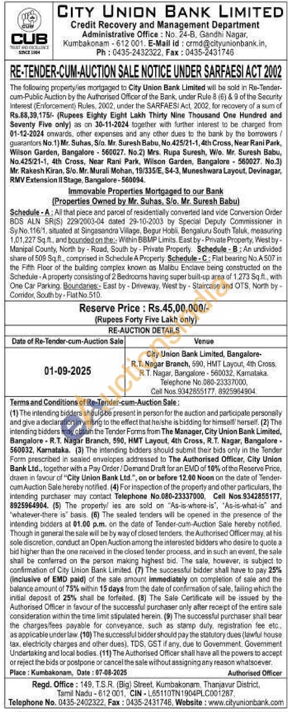 Immovable Properties Mortgaged to our Bank (Properties Owned by Mr. Suhas, S/o. Mr. Suresh Babu)
