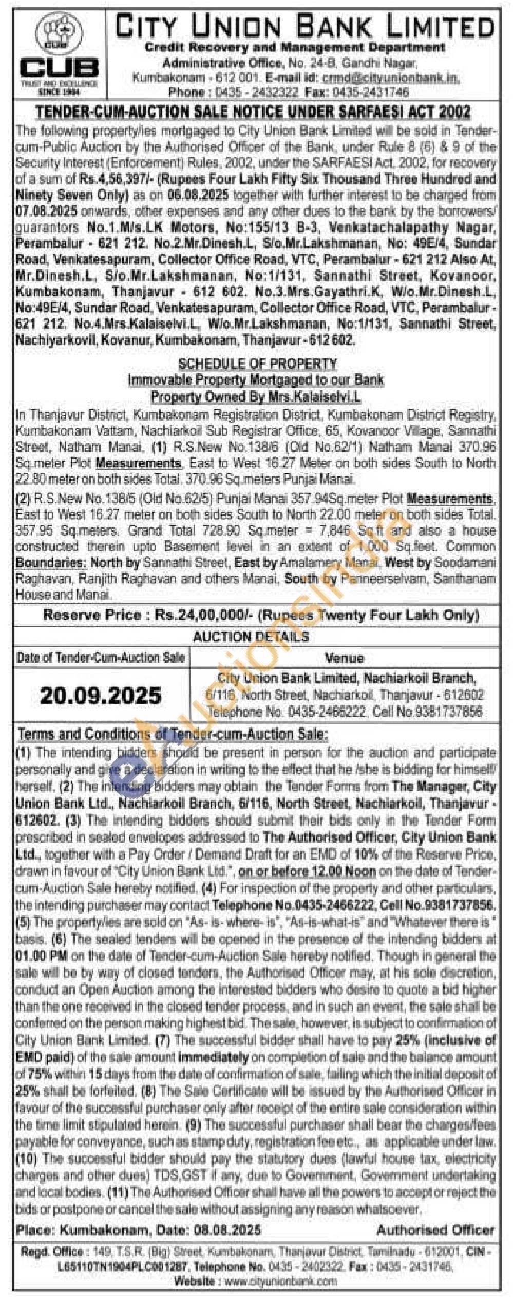 (2) R.S.New No. 138/5 (Old No.62/5) Punjai Manai 357.94Sq.meter Plot Measurements, East to West 16.27 meter on both sides South to North 22.00 meter on both sides Total. 357.95 Sq.meters. Grand Total 728.90 Sq.meter 7,846 Sq.ft and also a house constructed therein upto Basement level in an extent of 1,000 Sq.feet. Common Boundaries: North by Sannathi Street, East by Amalamery Manai, West by Soodamani Raghavan, Ranjith Raghavan and others Manai, South by Panneerselvam, Santhanam House and Manai