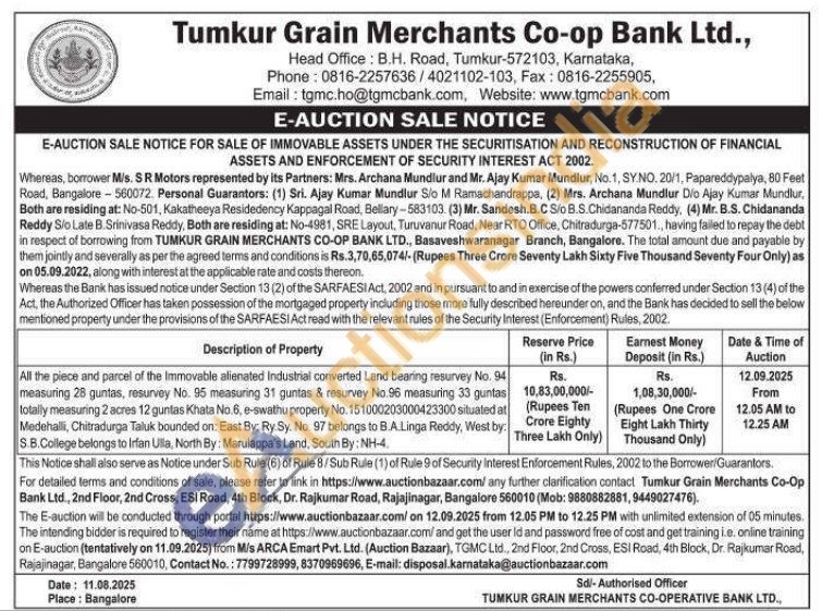 All the piece and parcel of the Immovable alienated Industrial converted Land bearing resurvey No. 94 measuring 28 guntas, resurvey No. 95 measuring 31 guntas & resurvey No.96 measuring 33 guntas totally measuring 2 acres 12 guntas Khata No.6, e-swathu property No. 151000203000423300 situated at Medehalli, Chitradurga Taluk bounded on: East By: Ry Sy. No. 97 belongs to B.A.Linga Reddy, West by: S.B.College belongs to Irfan Ulla, North By: Marulappa's Land, South By: NH-4.