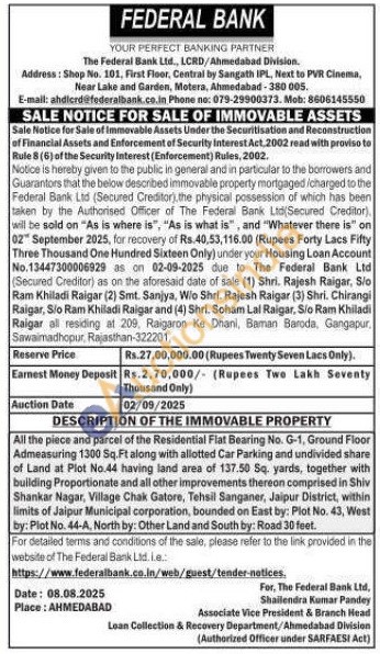 All the piece and parcel of the Residential Flat Bearing No. G-1, Ground Floor Admeasuring 1300 Sq.Ft along with allotted Car Parking and undivided share of Land at Plot No.44 having land area of 137.50 Sq. yards, together with building Proportionate and all other improvements thereon comprised in Shiv Shankar Nagar, Village Chak Gatore, Tehsil Sanganer, Jaipur District, within limits of Jaipur Municipal corporation, bounded on East by: Plot No. 43, West by: Plot No. 44-A, North by: Other Land and South by: Road 30 feet