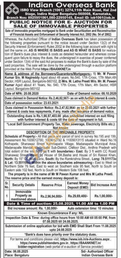 Schedule of Property: All that piece and parcel of land in survey No. 195 and 199, Assessment No. 1009012790, 1009012792 & 11009013115 situated in Ward No.16 Kothapele, Shanawaz Street Kammapalle Village, Madanapalle Municipal Area, Madanapalle Mandal, Madanpalle Sub-District, Chittoor Dist., Andhra Pradesh with total extent of the site 8892 sq ft with boundaries: East: By 3 ft width CC Road/Shanawaz Street. West: By House of SK.Basha and House of Sri Rasool Khan, North: By 15" CC Road/Lane, South: By the Ramkrishna Street, Long: 78.5111730 & Lat: 13.5511000, Within the above boundaries admeasuring:- East to West on Northern Side 76 feet, East to west on Southern side 95 feet, North to South on Eastern side 102 feet, North to South on Westem Side 106 feet,