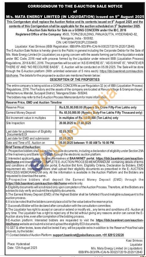• Borrower Name :  M/s. MATA ENERGY LIMITED (IN LIQUIDATION)
