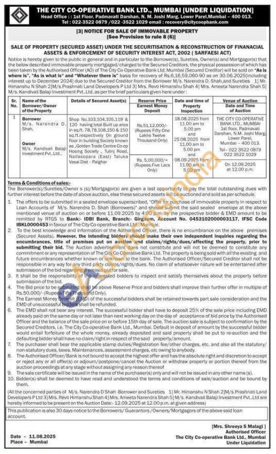 Shop No.103.104.105.119 & 120 having total Built up area in sq.ft. 78.78.108.1508 150 sq.ft.respectively On ground floor in building Society known as Golden Trade Centre Co-op Hosing Society Tuling Road, Naliasopara (East) Taluka Vasai Dest-Palghar