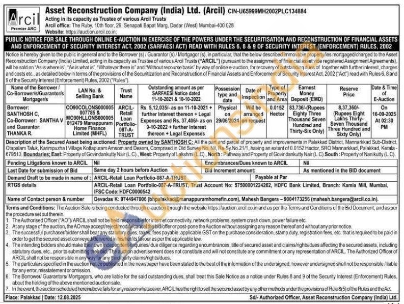 property and improvements in Palakkad District, Mannarkkad Sub-District, Otapalam Taluk, Karimpuzha I Village Kottapuram Amsom and Desom, Comprised in Oid Survey No. Nil, Re-Sy.No.21/1, having an extent of 0.0152 Hector, SRO Mannarkkad, Palakkad, Kerala -679513. Boundaries; East: Property of Govindankutty Nair (L.C), West: Property of Lakshmi (L.C). North: Pathway and Property of Govindankutty Nair (LC) South: Property of Nanikutty (L.C).